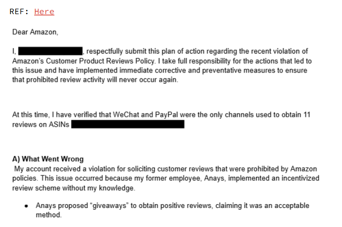 2. Corrective Actions: What have you already done to fix the problem? (e.g., “I have audited all my inventory, removed the affected ASINs, and terminated my relationship with the supplier in question.”)