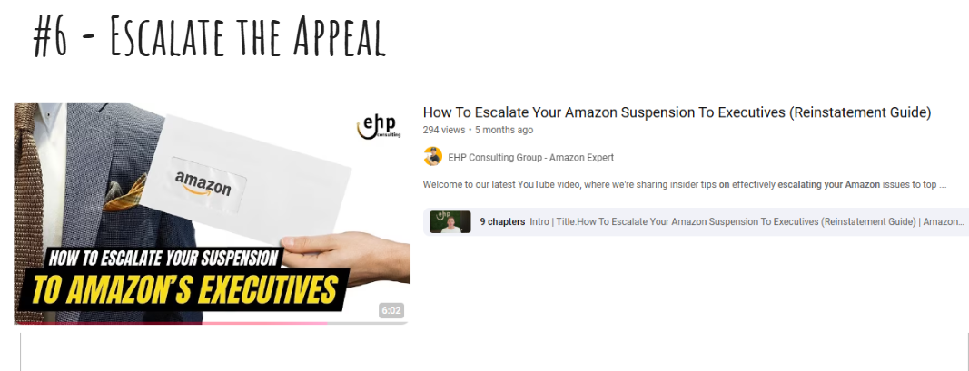 Your other option is to hire an experienced Amazon consultant. As a Florida Amazon Consultant group, we at EHP Consulting Group handle these cases all the time. We have a list of appeals and templates that we know work for specific situations, from “Used Sold as New” and “Related Accounts” to counterfeit removal on Amazon.