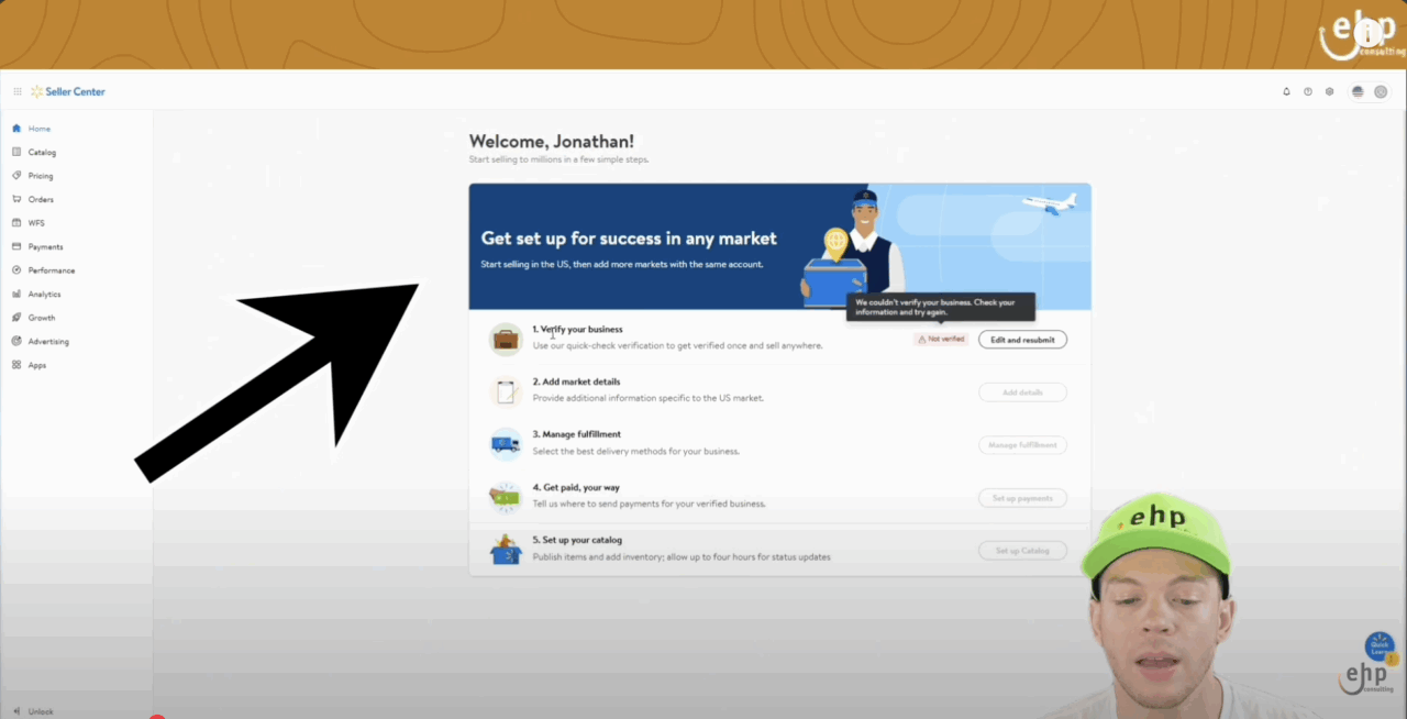 After you sign up, you’ll be taken to your Walmart Seller homepage, where you’ll see the prompt: “Time to Verify Your Business.”