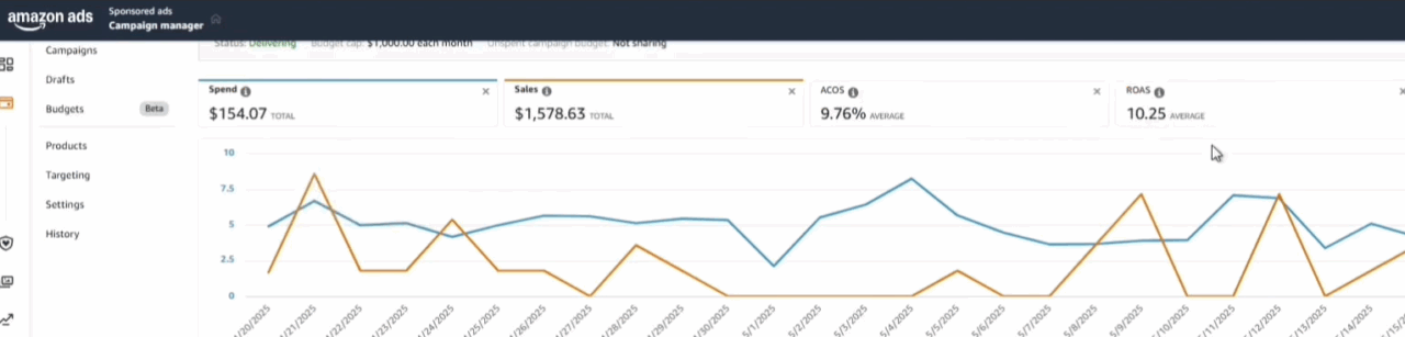 If you spend $154 and make $1,578 from your Amazon ads, your ROAS is 10.25.