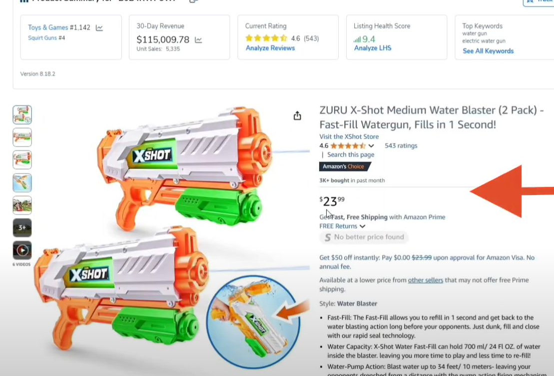 • A water gun with high-quality photos, Amazon’s Choice badge, competitive pricing, and great bullet points will convert better.