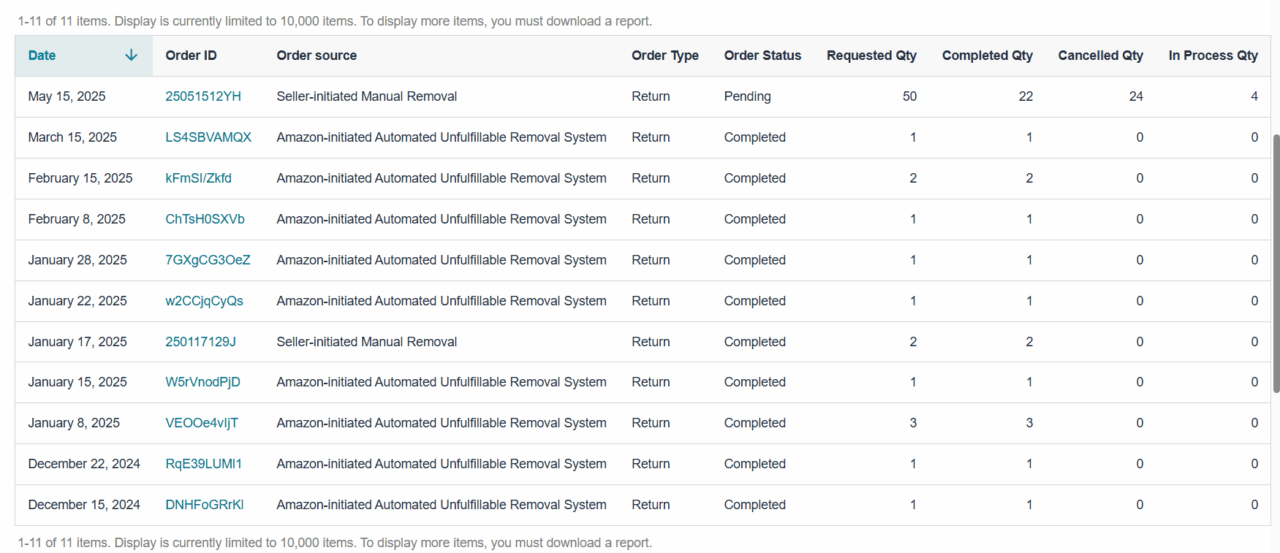 Once the report loads, find the order ID of the removal request you want to cancel. - Click the Order ID